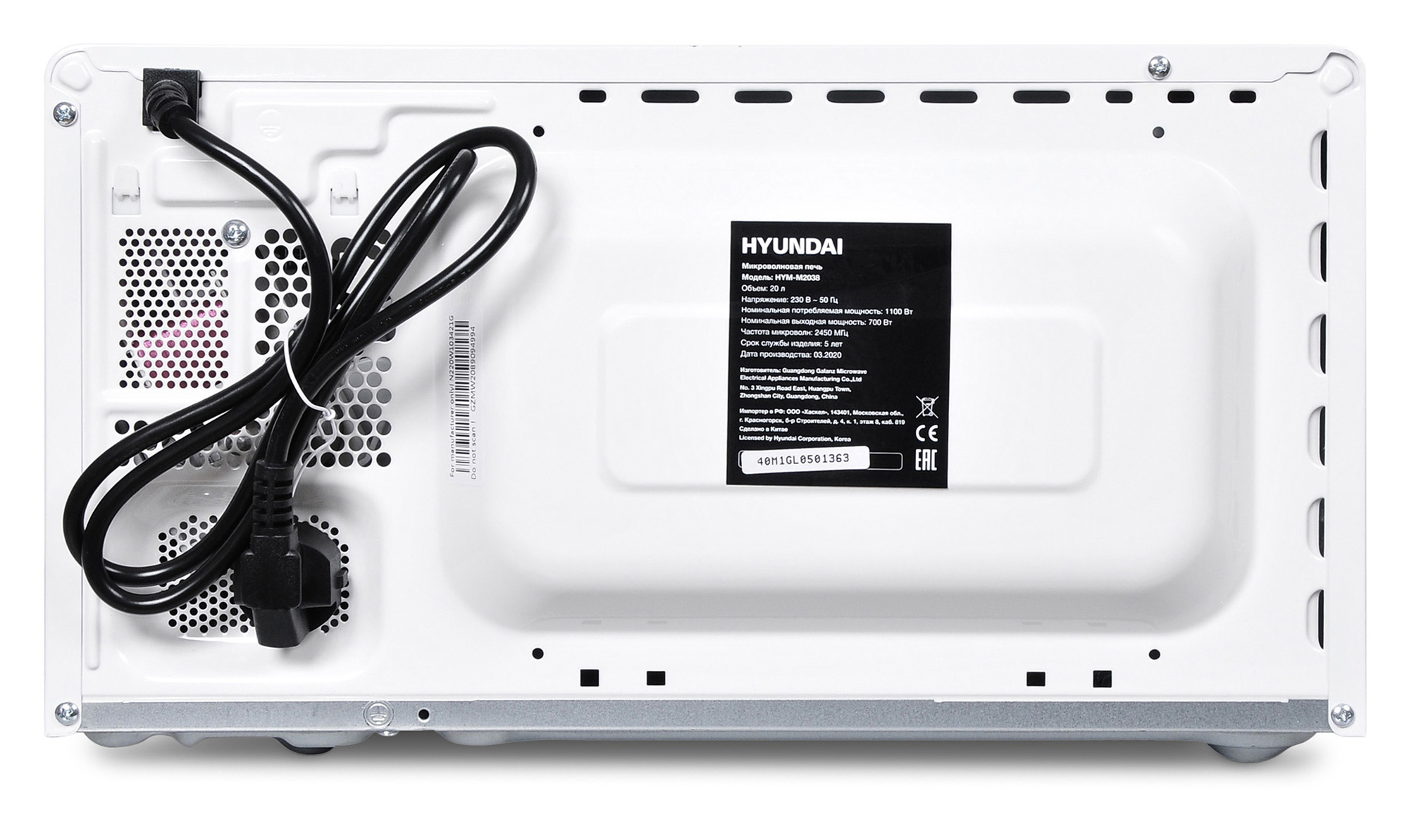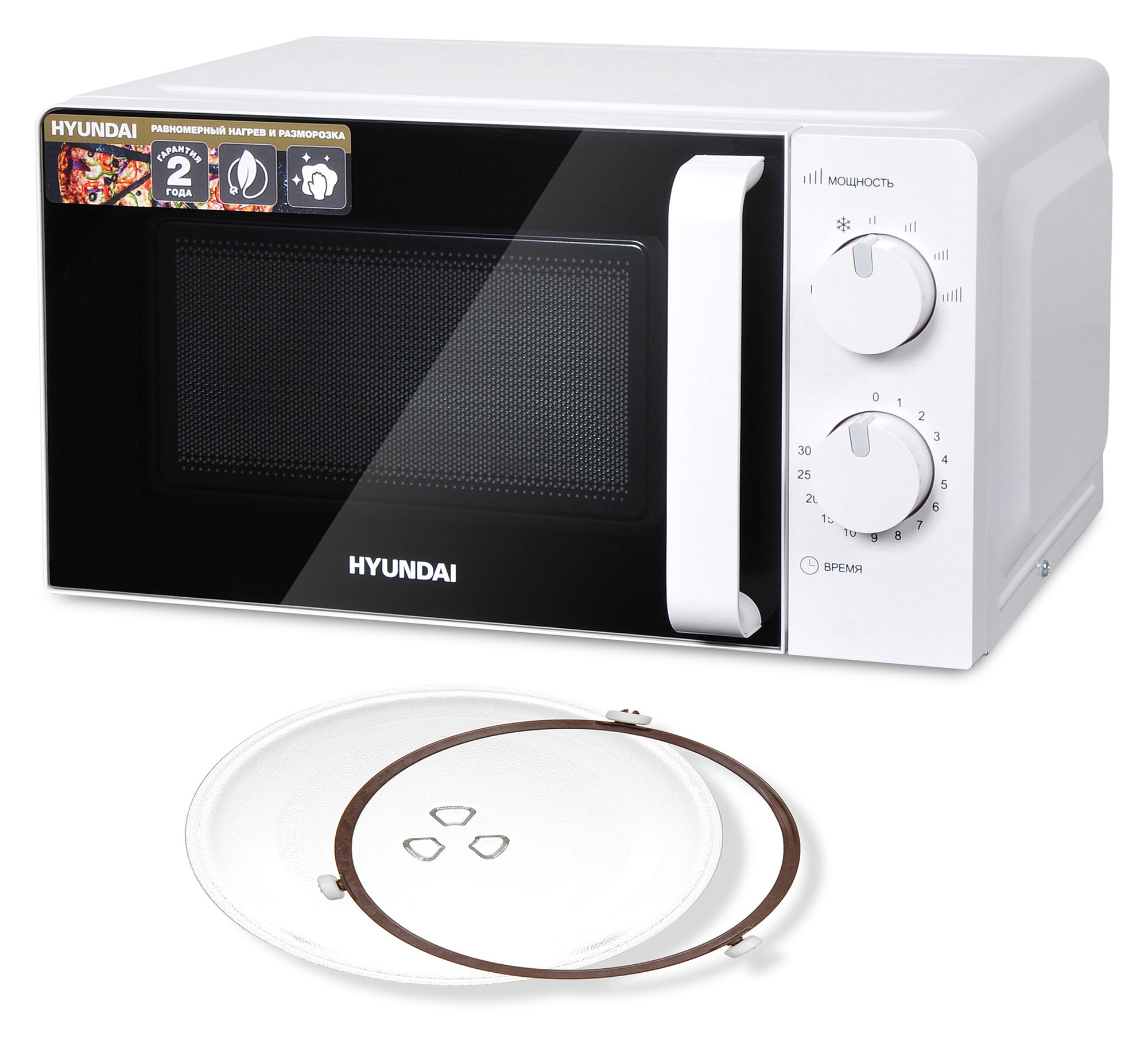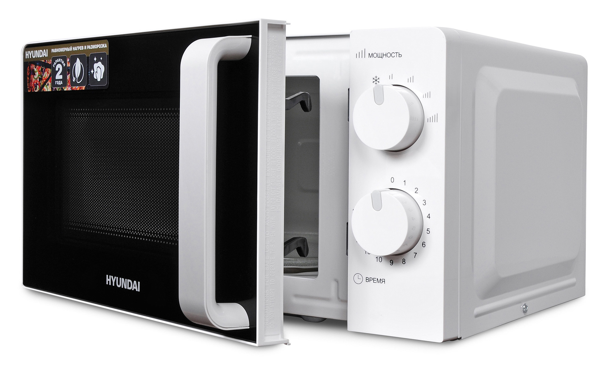 Микроволновка оснащена эргономичной ручкой, за которую её легко открывать, а в конце цикла прибор издаёт характерный громкий сигнал. В комплекте с Hyundai HYM-M2038 поставляется инструкция полностью на русском языке.