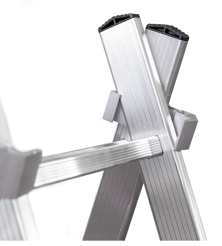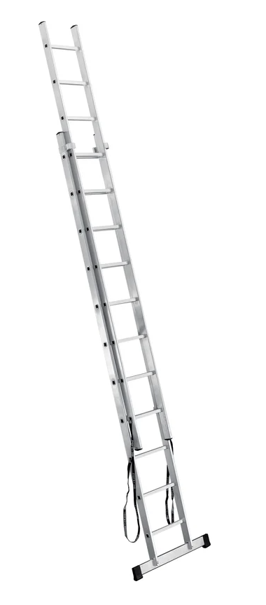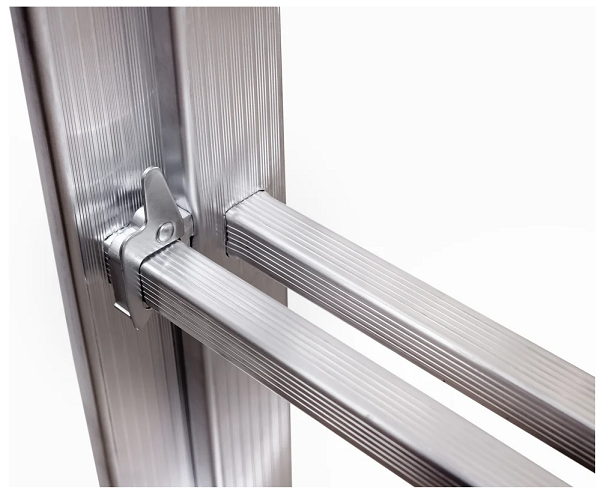 Имеет широкие алюминиевые скобы, обеспечивающие плотный зажим выносной секции и прочные страховочные стяжки, предохраняющие лестницу от самопроизвольного раскладывания.