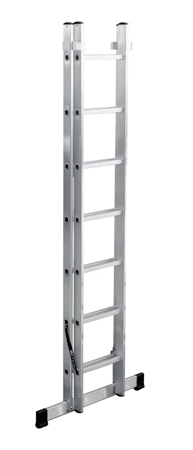 Имеет широкие алюминиевые скобы, обеспечивающие плотный зажим выносной секции и прочные страховочные стяжки, предохраняющие лестницу от самопроизвольного раскладывания.