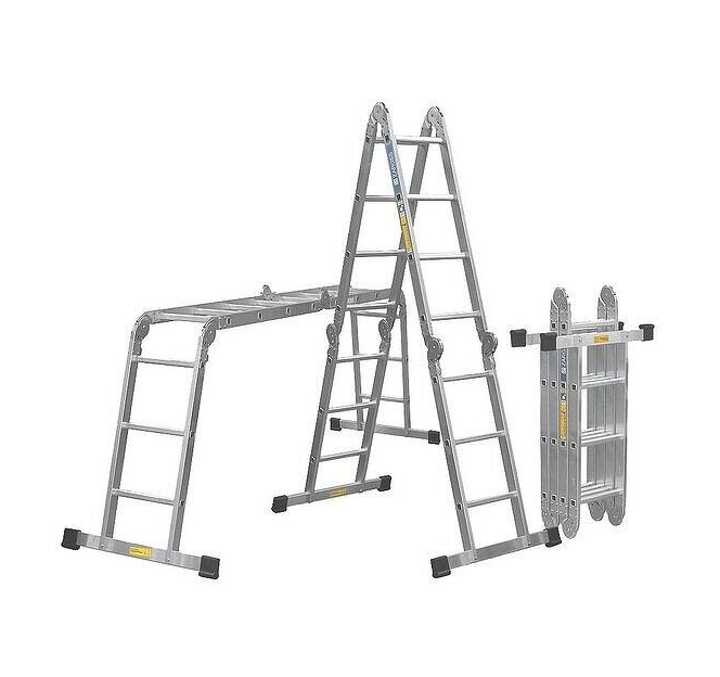 Лестница трасформер шарнирная алюминиевая представляет собой кострукцию из 4-х секций по 3 ступени, которые надёжно фиксируются стопорными шарнирами. Удобство пользования достигается также за счёт двойного восхождения, так как нет необходимости постоянно переворачивать и передвигать лестницу. Каждый шарнир лестницы фиксируется в трёх определённых положениях. При использовании этой лестницы в положении помоста рекомендуется применять оригинальный настил-площадку. Он не только позволит увереннее себя чувствовать на лестнице, но и продлит срок службы центрального шарнира, так как нагрузка будет распределяться более равномерно. В положении помоста, шарнирная лестница может использоваться в качестве своеобразного стола-верстака.
