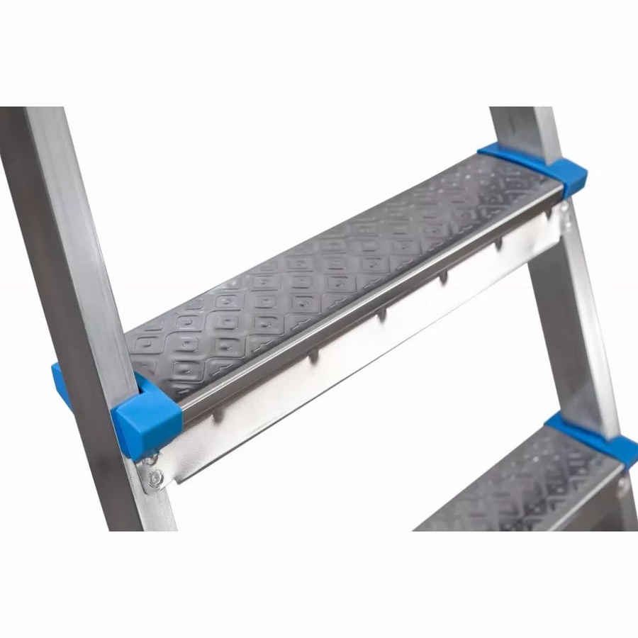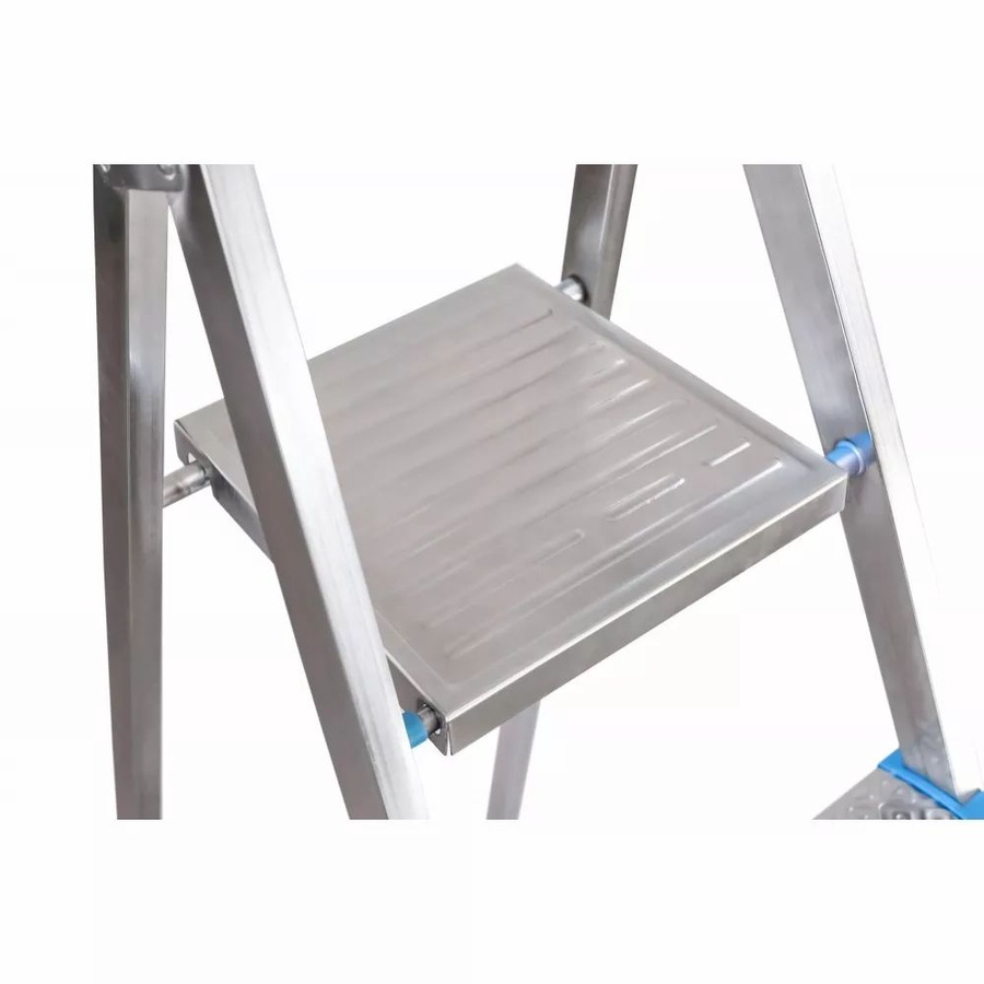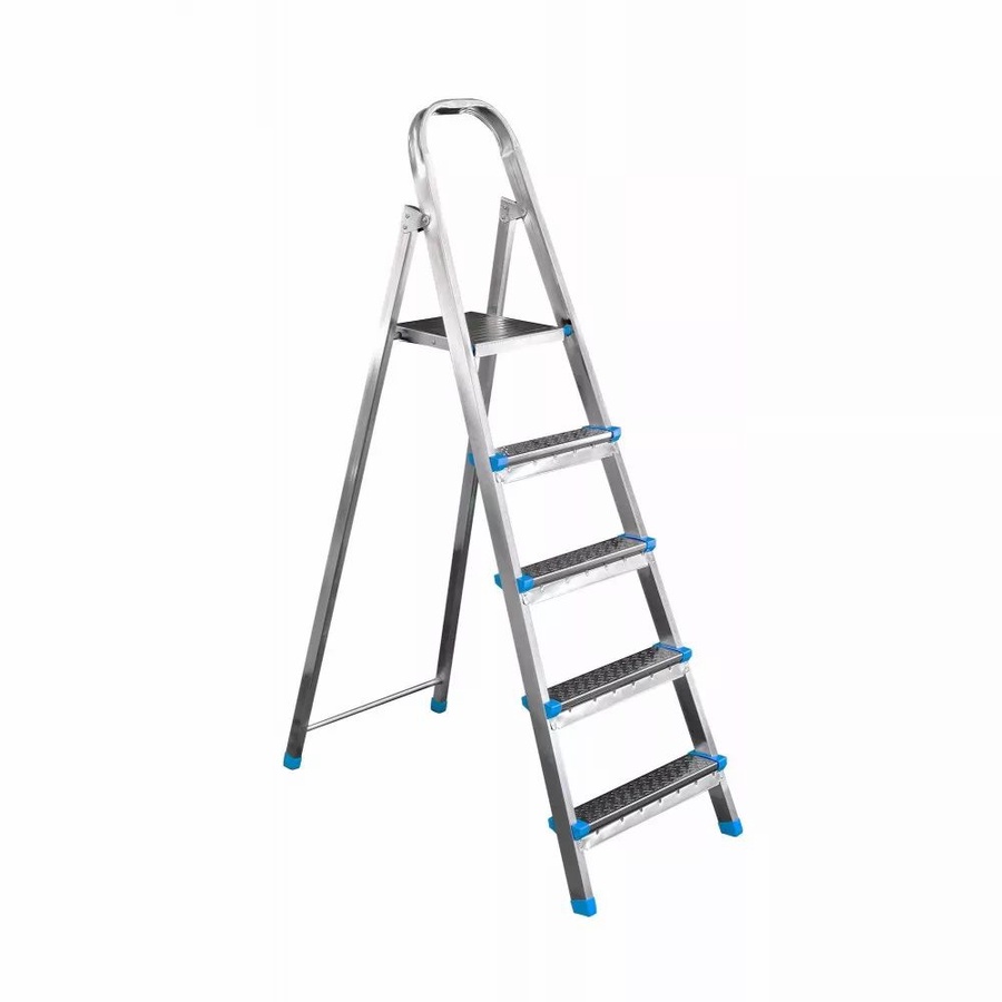 Данная модель лестницы обладает пятью ступенями и односторонним дизайном. Стальной каркас имеет специальное гальваническое покрытие. Все ступени этой стремянки надежно закреплены на двух стойках, а их рельефная поверхность помогает легче и увереннее стоять на них. Кроме того, ступеньки оборудованы особыми накладками из пластика, благодаря которым можно не опасаться серьезных порезов или ушибов. Лестница имеет достаточно широкую и комфортную площадку в своей верхней части, а высокая дуга обеспечивает дополнительную устойчивость и безопасность.