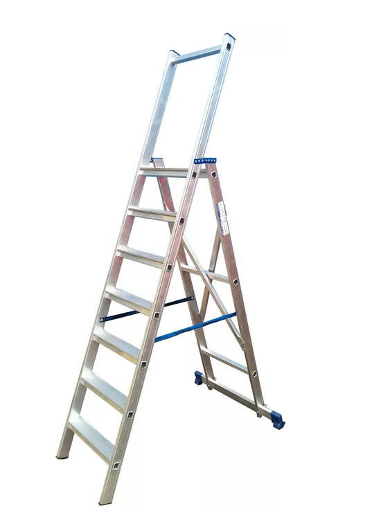 Стремянка профессиональная изготовлена из широкого профиля 60,0×20,0мм. Конструкция ступенек (за счет усиленных ребер жесткости), обеспечивает их стабильную работу при постоянных высоких нагрузках.Крепление ступенек реализовано методом вальцевания (без заклепок), что значительно увеличивает твердость, устойчивость и стабильность при эксплуатации. Благодаря вышеуказанным показателям достигнута грузоподъемность стремянки до 250 кг.