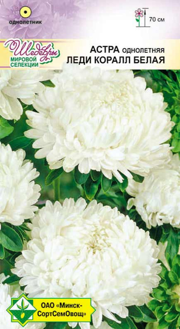 Новейший роскошный крупноцветковый сорт. Среднего срока цветения. Куст пирамидальный, прочный, высотой до 70 см. Цветет обильно и долго. Одно растение дает 8-12 стеблей для срезки. Завораживает красота густомахровых хризантемовидных соцветий снежно-белой окраски диаметром 10-12 см. Твердые длинные стебли, изящные соцветия и превосходная их сохранность делают эти астры непревзойденными для срезки и оформления клумб.