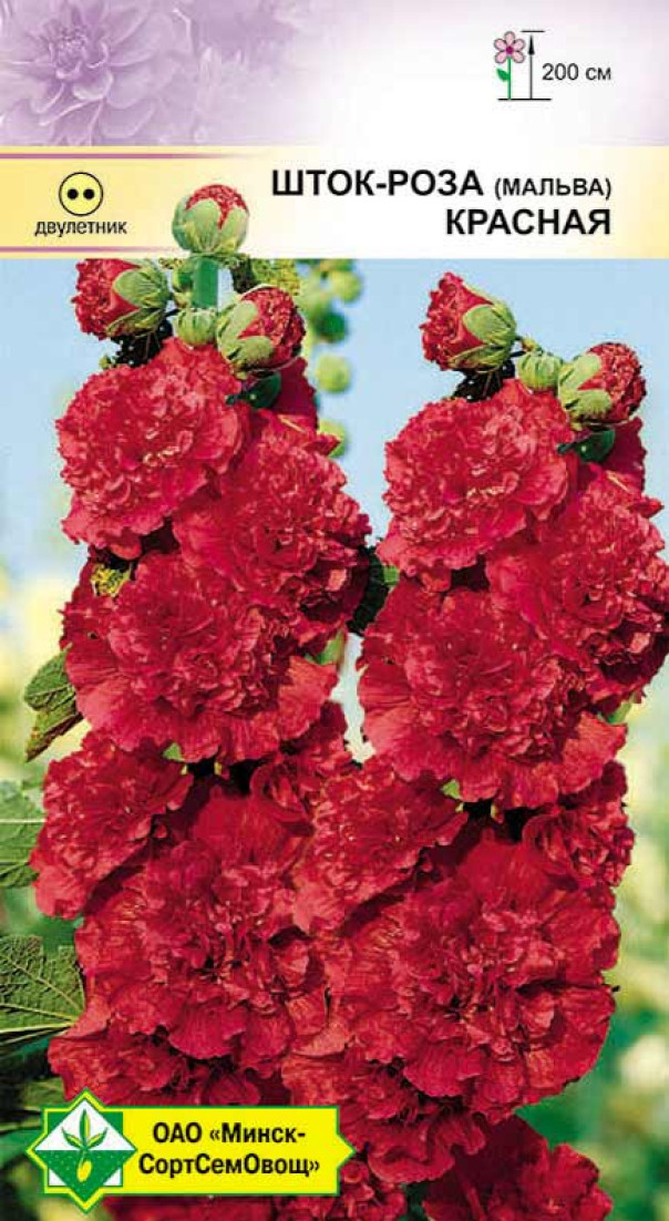Двулетнее растение высотой до 2 м. Цветки ярко-красные, махровые, в диаметре 10-12 см, собраны в изящные колосовидные соцветия. Для декорирования оград и зданий, прекрасно смотрится на заднем плане цветника. В букете сохраняется до 10 дней. Семена высевают в конце мая - начале июня. На постоянное место пересаживают с комом земли в конце августа. Хорошо зимует при легком укрытии. Засухоустойчива.
