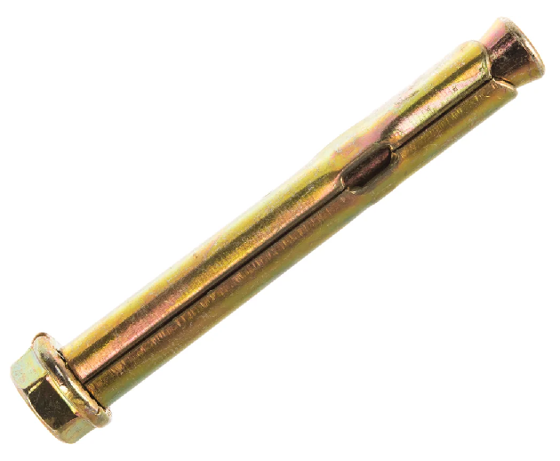 Анкерный болт состоит из резьбовой шпильки с приваренной к ней втулкой, внешней оболочки - металлической расклинивающей основой, и гайки с фланцем (гайки с запрессованной шайбой).