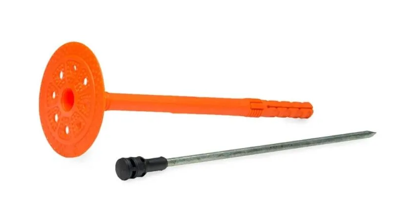 крепежная система состоит из распорного дюбеля диаметром 10 мм с удерживающим диском диаметром 60мм. Комплектуется гвоздем из оцинкованной стали с наплавленной термоизоляционной головкой.