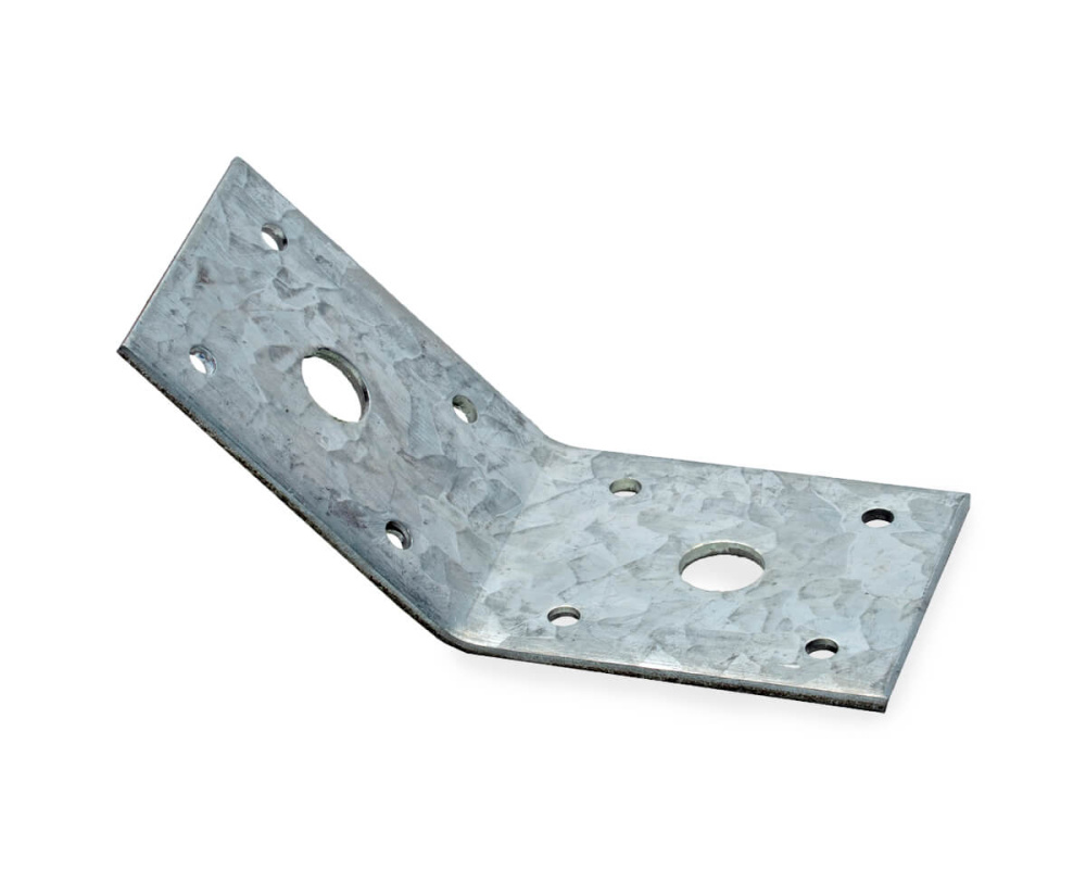 Уголок крепежный под 135 градусов KUS представляет собой металлическую пластину, согнутую под углом 135 градусов со сторонами одинаковой длины. Применяется для соединения деревянных стропил, а также для монтажа деревянных крыш. Получил универсальное применение, когда элементы конструкции необходимо скрепить под углом 135 градусов. Наличие больших отверстий позволяет использовать анкерную технику для соединения деревянных конструкций к бетону, кирпичу. Крепление осуществляется гвоздями или шурупами (к бетону/кирпичу - анкерами). Большие отверстия имеют диаметр 11 или 13 мм (диаметр зависит от размера крепежного уголка), маленькие — 5 мм.