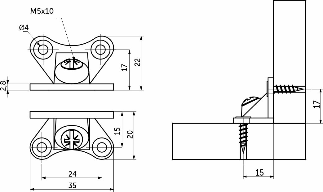 Уголок двухсоставной, в комплект входит 2 части уголка + винт. Весовая нагрузка до 300 кг. Стяжка-бабочка или «Butterfly». Название свое она получила из-за внешнего сходства с формой крыльев бабочки. Стяжка-бабочка может быть двух исполнениях – металлический корпус и пластиковый прозрачный корпус. Эта стяжка состоит из двух частей, каждая из которых прикручивается саморезами к соответствующей детали и путем наложения с помощью винта, поставляющегося в комплекте, происходит надежное стягивание.