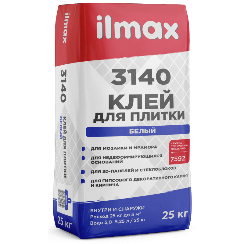 Плиточный клей ilmax 3000 предназначен для приклеивания керамической плитки размером до 40x40 см, керамической мозаики, а также цементных, бетонных плиток толщиной не более 10 мм. Используется на жестких (недеформируемых) впитывающих основаниях из следующих материалов: бетон; цементные и цементно-известковые штукатурки; кирпич и блоки из ячеистого бетона; цементные стяжки.