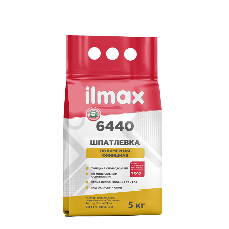 ilmax 6440 – белая шпатлёвка на основе полимерного вяжущего, минерального наполнителя и комплекса добавок. Суперпластичная консистенция растворной смеси обеспечивает удобонаносимость, лёгкое сведение слоёв, а жизнеспособность – позволяет наносить её одновременно на большую площадь. Трещиностойкая, после высыхания образует идеально гладкую и ровную поверхность, которая легко шлифуется.