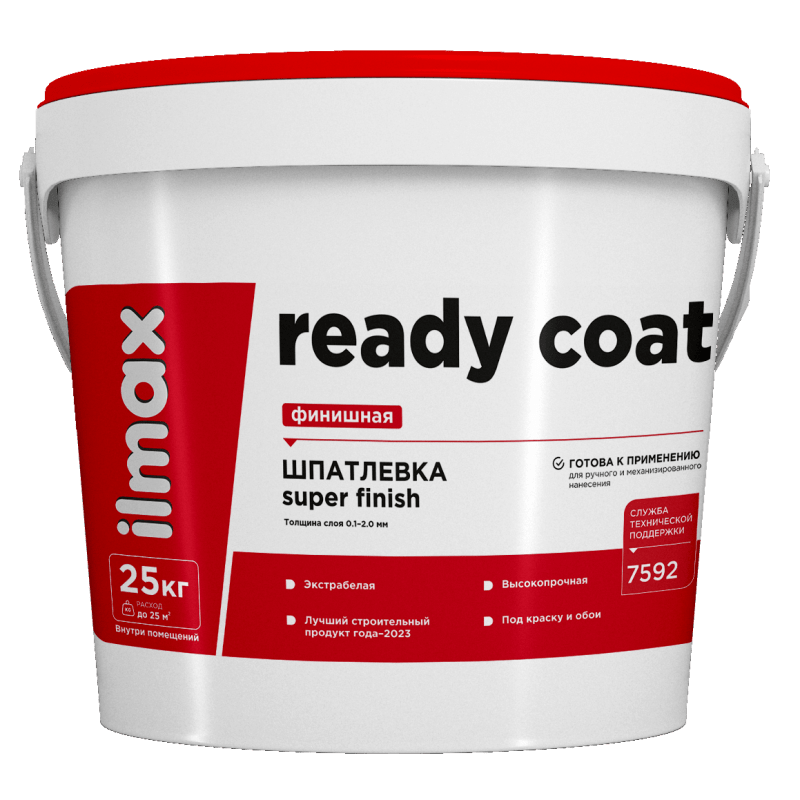 Шпатлевка полимерная финишная ILMAX Ready Coat белая 1,5 кг предназначена для финишного выравнивания шероховатостей, неровностей, заполнения царапин,трещин, выбоин и других дефектов, заделки стыков гипсокартонных листов с использованием армирующей ленты, с целью получения идеально ровной и гладкой поверхности стен и потолков, откосов проемов. Используется по минеральным поверхностям: из бетона, цементных, цементно-известковых и гипсовых штукатурок, гипсокартонных и гипсоволокнистых листов, гипсовых плит. Рекомендуется для внутренних работ в помещениях с нормальным режимом эксплуатации, с последующей отделкой (окраска, оклейка обоями) поверхностей. Можно наносить в несколько слоев. Неиспользованный материал может храниться в закрытой таре в соответствии со сроком годности. Имеет высокую прочность и стойкость к истиранию. Для ручного и механизированного нанесения. Состав: дисперсия акрилового сополимера, минеральные наполнители, функциональные добавки, вода.
