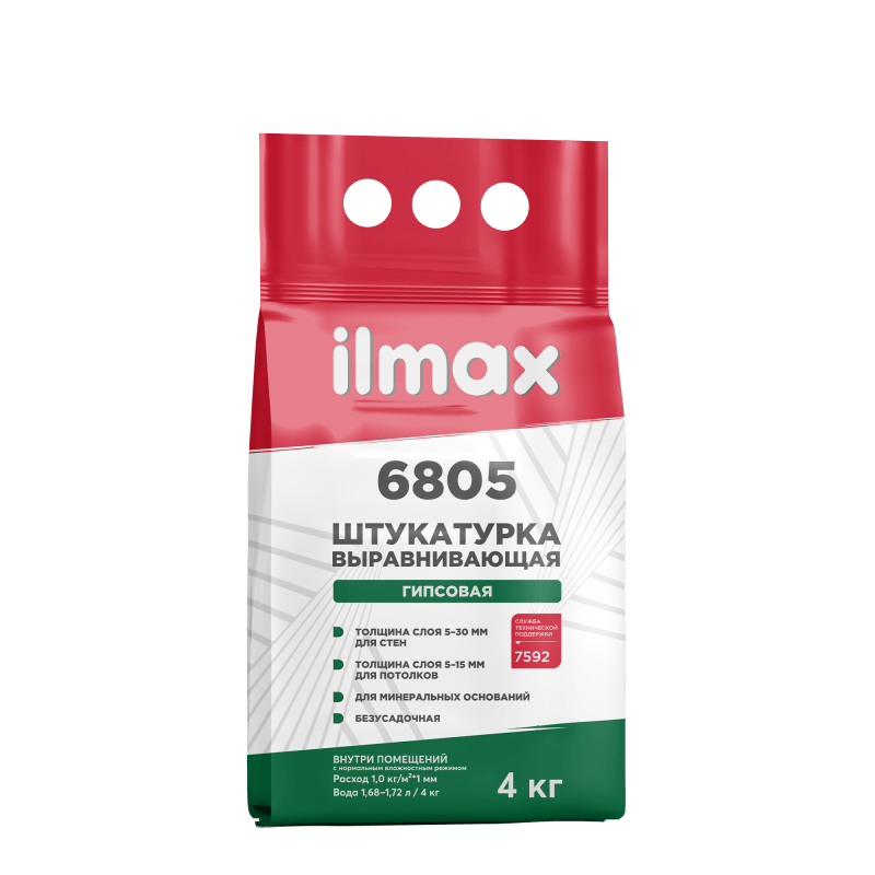 ilmax 6805 – выравнивающая штукатурка на гипсовом вяжущем с функциональными добавками после высыхания имеет плотную прочную поверхность, идеальную для выполнения шпатлёвочных работ. Материал безусадочный, что позволяет наносить его в широком диапазоне толщин и обеспечивать высокое качество отделки. Гипсовая штукатурка создает благоприятный микроклимат в помещении, экологически безопасна.