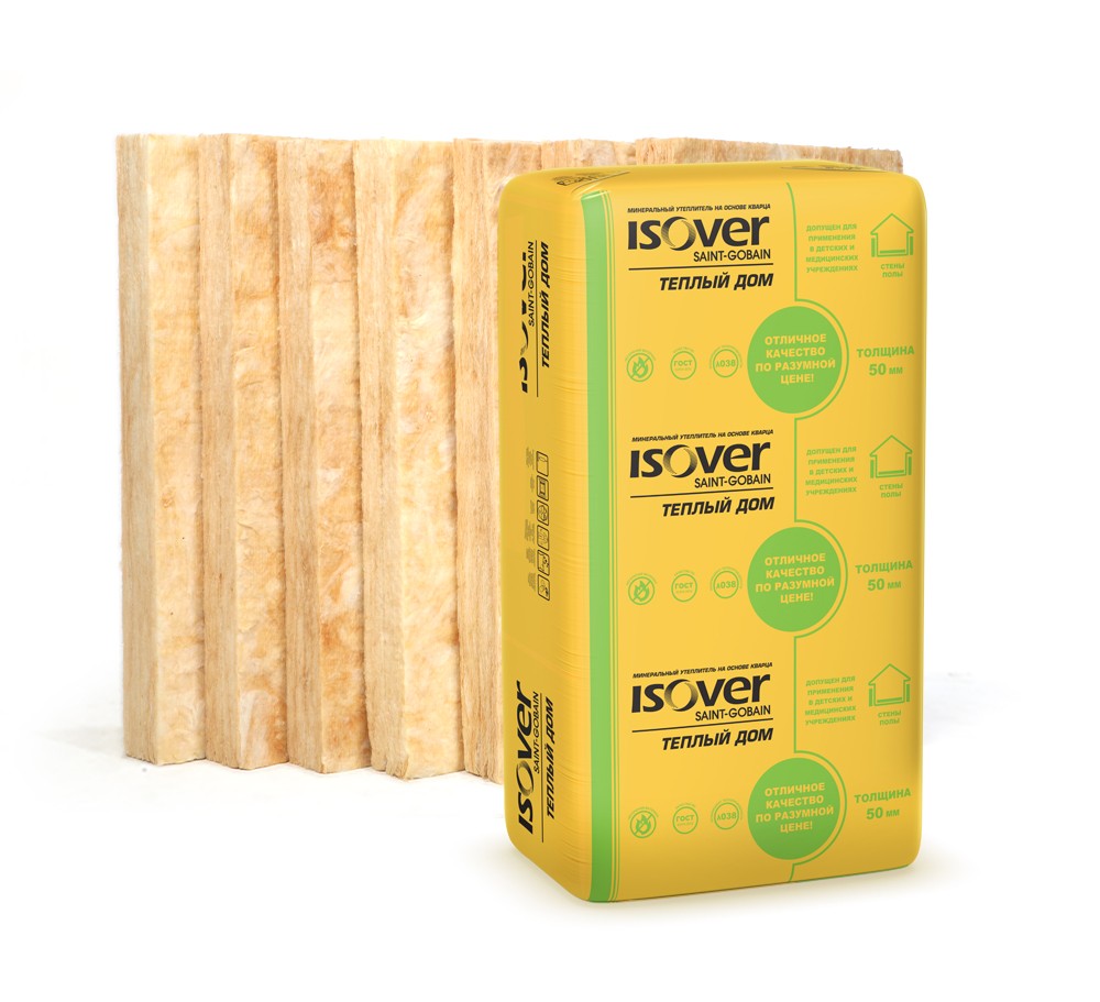 Плиты теплоизоляционные ISOVER Теплый дом /Е/К Warm House-Slab применяются для утепления стен изнутри и снаружи, звукоизоляции межкомнатных перегородок, утепления каркасных стен. Негорючий материал, легко разрезается, устанавливается без крепления (враспор). Изготовлены из расплава минерального сырья на основе стекловолокна. Толщина одной плиты — 50 мм. В упаковке — 14 плит размером 610х1170 мм. Упаковка покрывает 10 м2 площади.