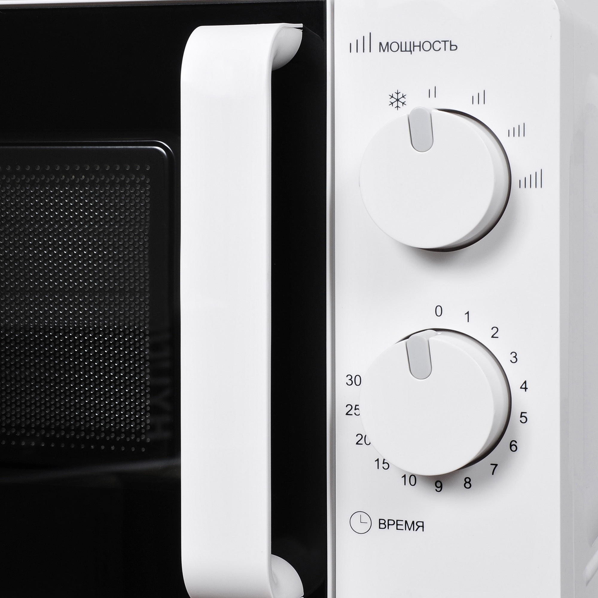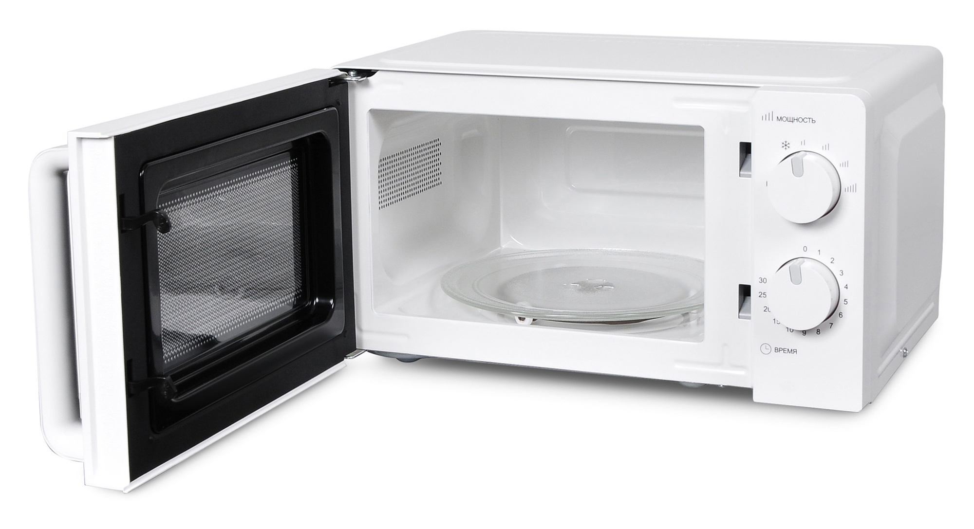Мощность прибора составляет 700 Вт. Настраивать её можно с помощью верхнего колеса, расположенного на передней панели. Всего режимов готовки предусмотрено пять: первый – разморозка, а остальные по нарастающей варьируют степень разогрева блюд. Нижнее колесо – это таймер, который настраивается до 30 минут. Любая тепловая обработка в печи происходит равномерно и эффективно.