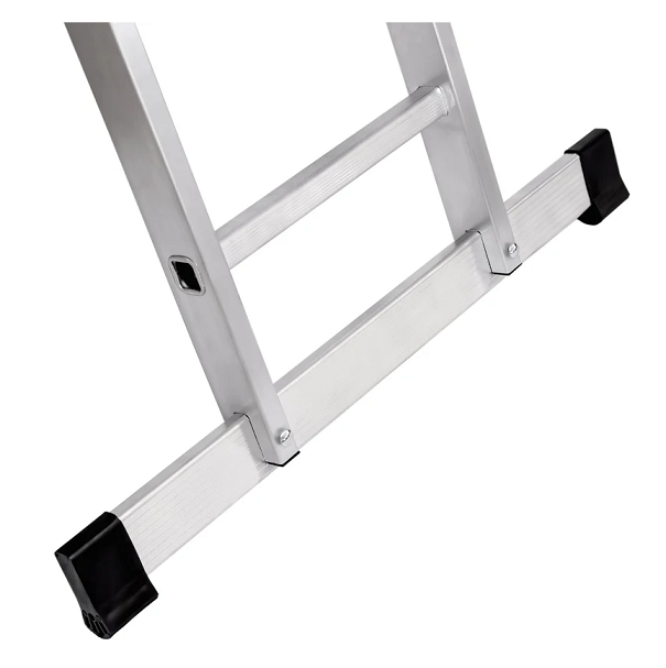 Имеет широкие алюминиевые скобы, обеспечивающие плотный зажим выносной секции и прочные страховочные стяжки, предохраняющие лестницу от самопроизвольного раскладывания.