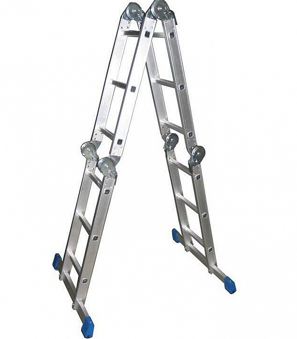 Лестница трасформер шарнирная алюминиевая представляет собой кострукцию из 4-х секций по 3 ступени, которые надёжно фиксируются стопорными шарнирами. Удобство пользования достигается также за счёт двойного восхождения, так как нет необходимости постоянно переворачивать и передвигать лестницу. Каждый шарнир лестницы фиксируется в трёх определённых положениях. При использовании этой лестницы в положении помоста рекомендуется применять оригинальный настил-площадку. Он не только позволит увереннее себя чувствовать на лестнице, но и продлит срок службы центрального шарнира, так как нагрузка будет распределяться более равномерно. В положении помоста, шарнирная лестница может использоваться в качестве своеобразного стола-верстака.