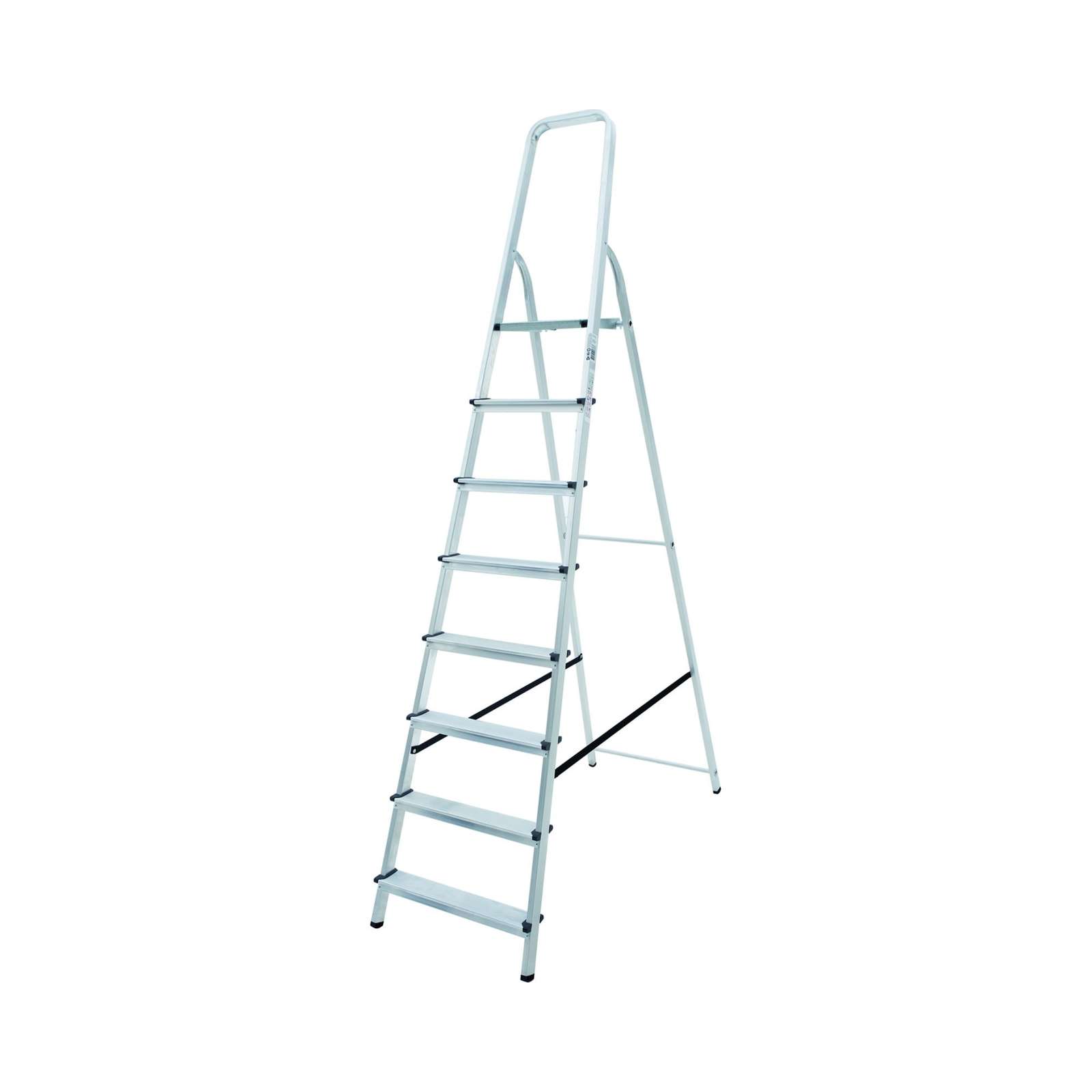 Лестница-стремянка алюминиевая TARKO (04108) 8 ступеней. Высота до площадки 164 см, общая высота 238 см. Лёгкая и прочная. Широкая стальная платформа, алюминиевый профиль, широкие алюминиевые ступени с рифленой антискользящей поверхностью, пластиковые насадки на ножках обеспечивают стабильность. Для большей безопасности комплектуется прочными тросами-фиксаторами положения.