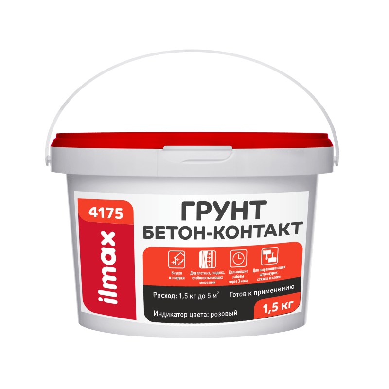 ilmax 4175 бетон-контакт – грунт розового цвета на основе дисперсии акрилового сополимера с калиброванным заполнителем из мрамора, обеспечивающий высокоадгезионный контактный слой. Индикатор цвета позволяет равномерно и без пробелов нанести грунт, тем самым обеспечив высокое качество подготовки основания. Бетон-контакт образует прочную шероховатую полимерную плёнку для гарантированного сцепления последующих слоёв с основанием.