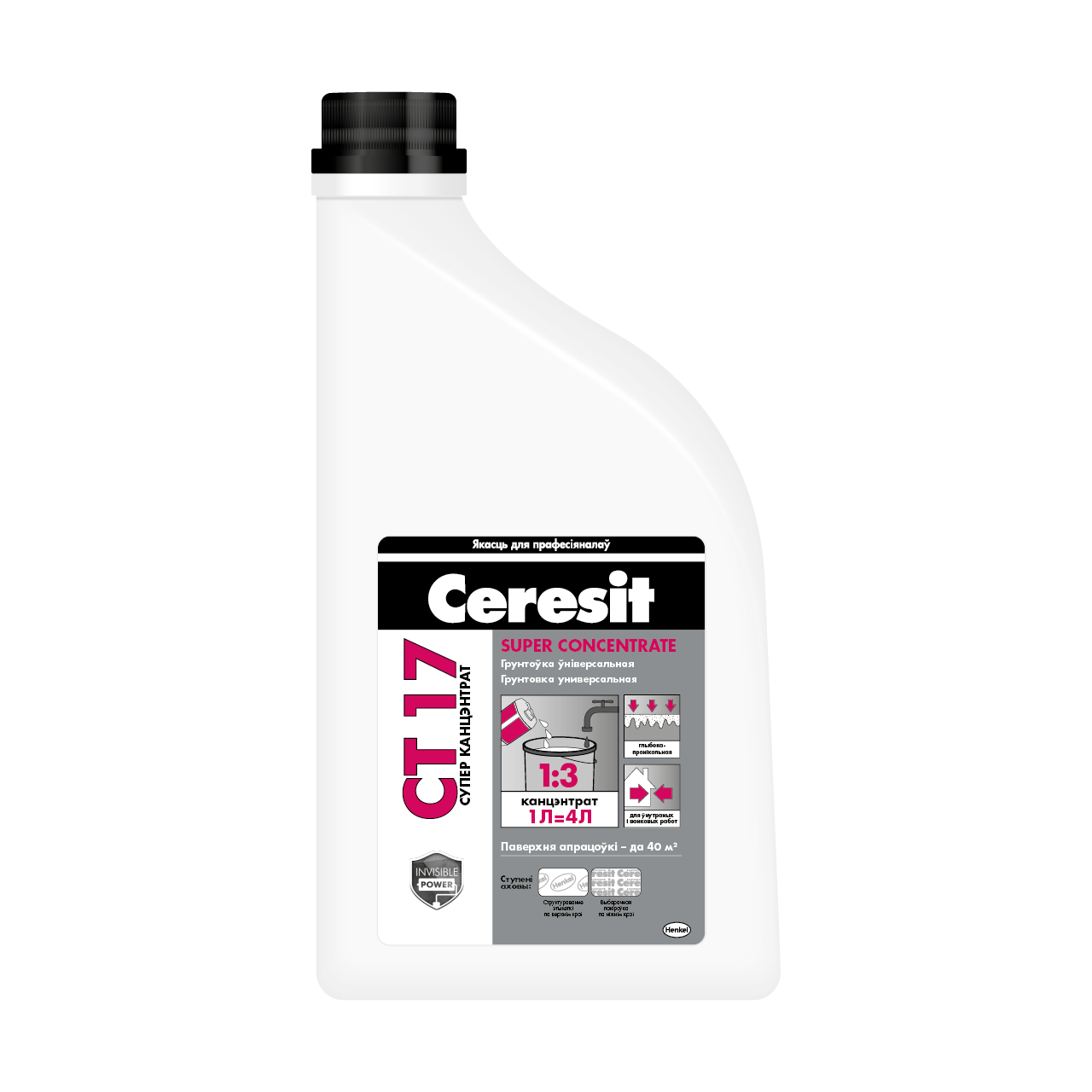 Грунтовка CT 17 Super Concentrate применяется для поверхностного укрепления и пропитки любых минеральных оснований (газосиликатные блоки, бетон, железобетон, штукатурка, гипсовые и кирпичные поверхности и др.) внутри и снаружи зданий перед оклейкой обоями, окраской, шпатлеванием, приклеиванием теплоизоляционных плит, нанесением штукатурки, также может применяться перед укладкой керамической плитки, напольных выравнивающих смесей (стяжек, самонивелиров), полимерных гидроизоляционных мастик. CT 17 Super Concentrate особенно рекомендуется для использования на гипсовых, ангидритовых и газосиликатных основаниях. Грунтовка проникает в основание и связывает зерна наполнителя, однако при этом не увеличивает прочностные параметры по всему сечению основания.