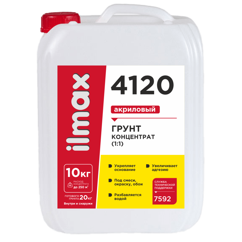 ilmax 4120 — грунт-концентрат (1:1) на основе дисперсии акрилового сополимера проникает в основание, обеспыливая и упрочняя его. После обработки поверхности грунтом снижается водопоглощение, тем самым предотвращается быстрое высыхание наносимых в дальнейшем материалов и обеспечивается их равномерный набор прочности. Обработка грунтом увеличивает адгезию между основанием и наносимыми материалами. После высыхания — прозрачный.