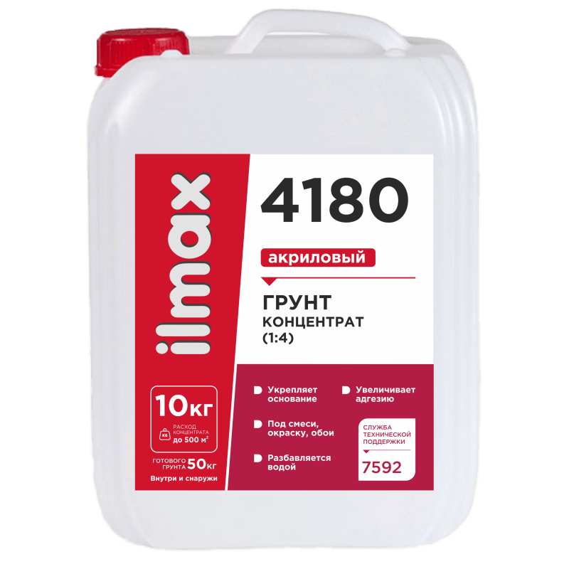 ilmax 4180 — грунт-концентрат (1:4) на основе дисперсии акрилового сополимера проникает в основание, обеспыливая и упрочняя его. Грунт-концентрат разбавляется водой в разных пропорциях, что позволяет приготовить раствор для оснований с разной впитывающей способностью. После обработки поверхности грунтом снижается водопоглощение, тем самым предотвращается быстрое высыхание наносимых в дальнейшем материалов и обеспечивается их равномерный набор прочности. Обработка грунтом увеличивает адгезию между основанием и наносимыми материалами. После высыхания — прозрачный.
