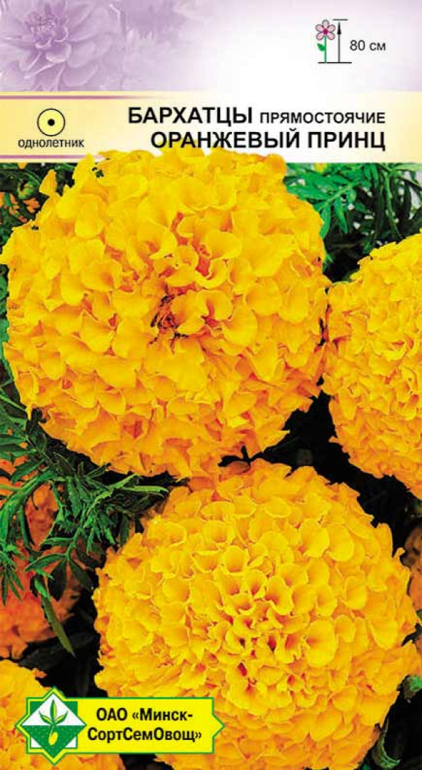 Однолетнее растение высотой около 80 см. Соцветия крупные, в диаметре 8-10 см, махровые, ярко-оранжевые. Цветут обильно до первых заморозков. Популярны для клумб, хороши в букетах. Семена высевают на рассаду в конце марта-апреле или прямо в открытый грунт в мае. Рассаду высаживают в открытый грунт в мае, когда минует угроза заморозков. Пересадку переносят хорошо. Размещают на солнечном месте или в полутени.