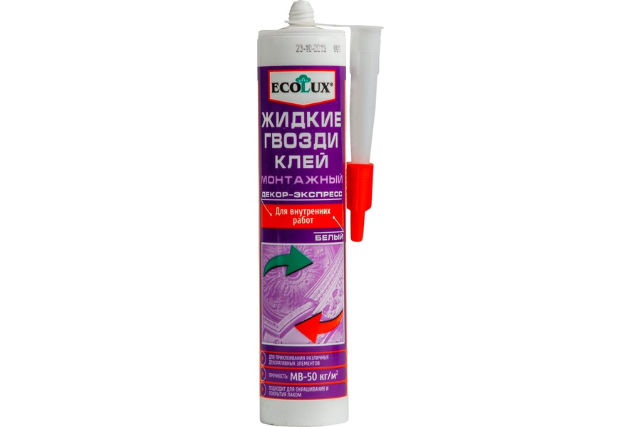 Монтажный клей Жидкие гвозди ECOLUX Декор-Экспресс 310 мл 4607133682996 предназначен для приклеивания декоративных элементов из стиропора, пенополистирола, пенопласта, не тяжелых изделий из пенополиуретана, гипса, пластика, гипрока, керамики, древесины, ПВХ на впитывающие строительные основания (древесина, бетон, кирпич, штукатурка, гипсокартон). Подходит для окрашивания и покрытия лаком, не содержит растворителей. Не подходит для приклеивания зеркал, полиэтилена, пропилена, тефлона, силикона.