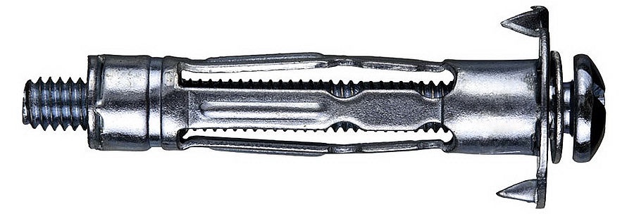 Материалы: дюбель изготовлен из гальванически оцинкованной стали. Особенности конструкции: дюбель состоит из полой цанги и винта. Цанга, в свою очередь, состоит из нераспорной части, длина которой подбирается под толщину несущей основы, и четырех фиксирующих сегментов. Бортик дюбеля защищает его от проваливания в отверстие. Острые зубцы, расположенные на стопорном бортике, предотвращают проворачивание дюбеля.