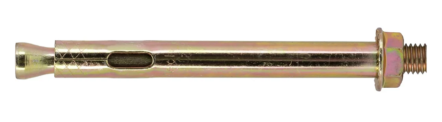 Анкерный болт состоит из резьбовой шпильки с приваренной к ней втулкой, внешней оболочки - металлической расклинивающей основой, и гайки с фланцем (гайки с запрессованной шайбой).