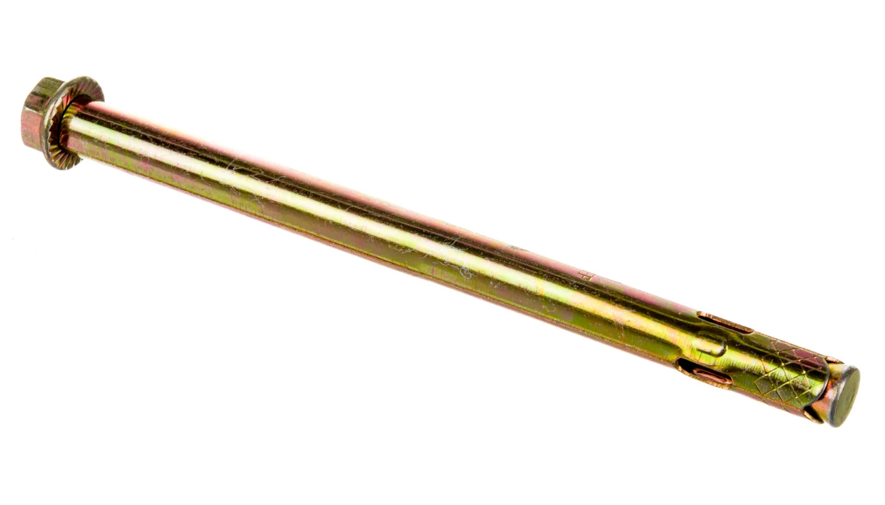 Анкерный болт состоит из резьбовой шпильки с приваренной к ней втулкой, внешней оболочки - металлической расклинивающей основой, и гайки с фланцем (гайки с запрессованной шайбой).