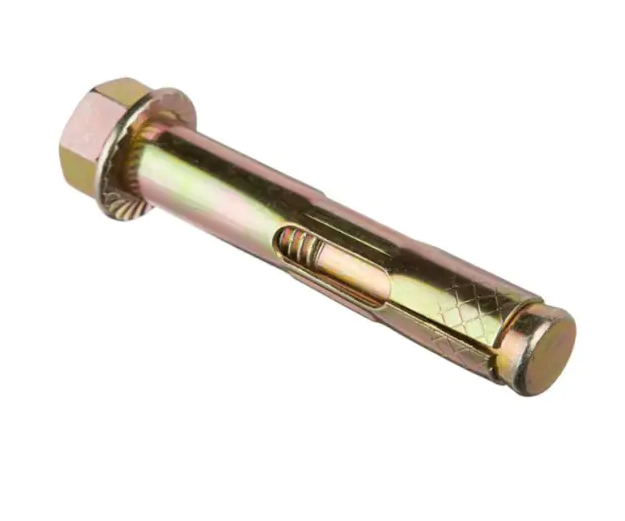 Анкерный болт состоит из резьбовой шпильки с приваренной к ней втулкой, внешней оболочки - металлической расклинивающей основой, и гайки с фланцем (гайки с запрессованной шайбой).