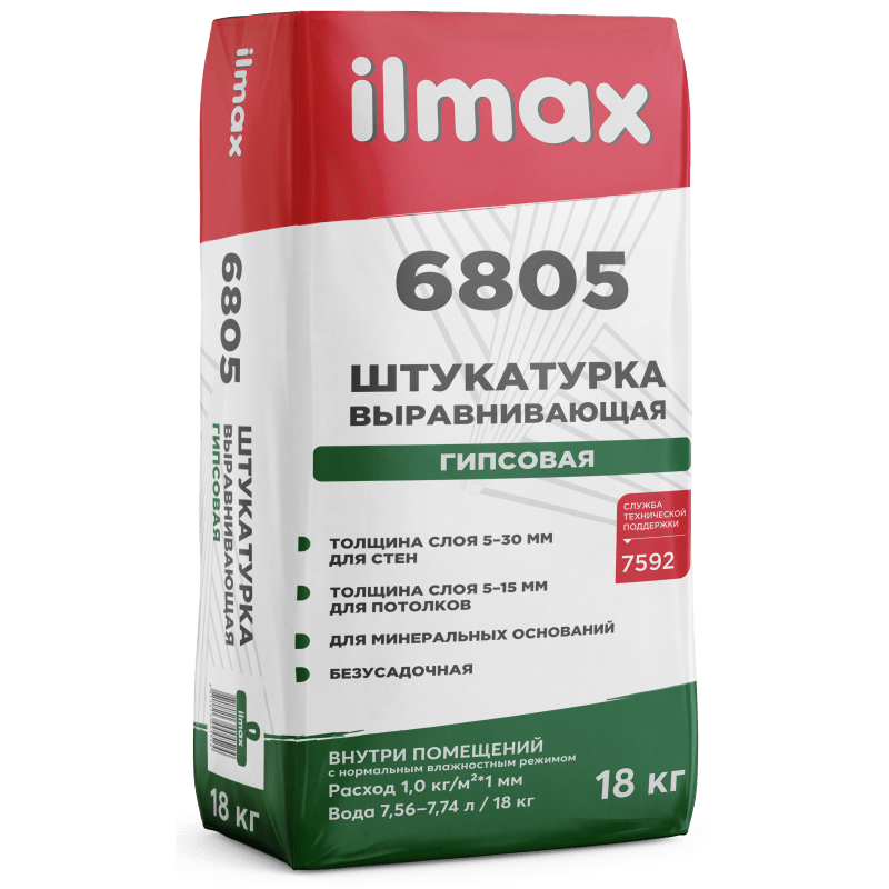 ilmax 6805 – выравнивающая штукатурка на гипсовом вяжущем с функциональными добавками после высыхания имеет плотную прочную поверхность, идеальную для выполнения шпатлёвочных работ. Материал безусадочный, что позволяет наносить его в широком диапазоне толщин и обеспечивать высокое качество отделки. Гипсовая штукатурка создает благоприятный микроклимат в помещении, экологически безопасна.